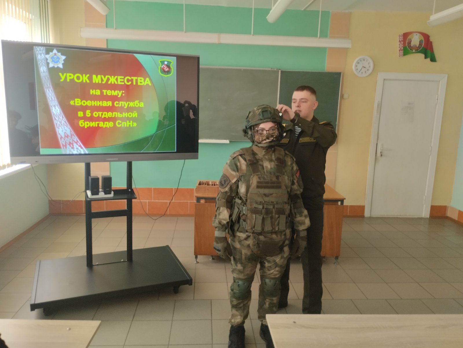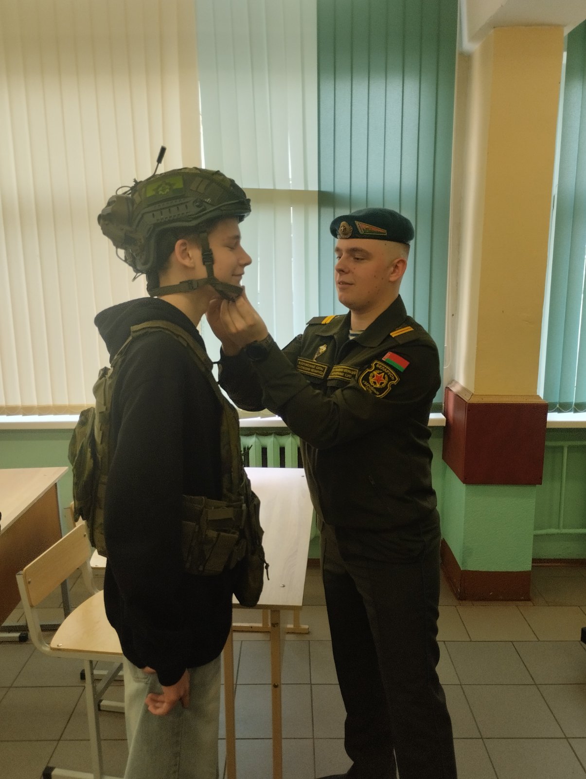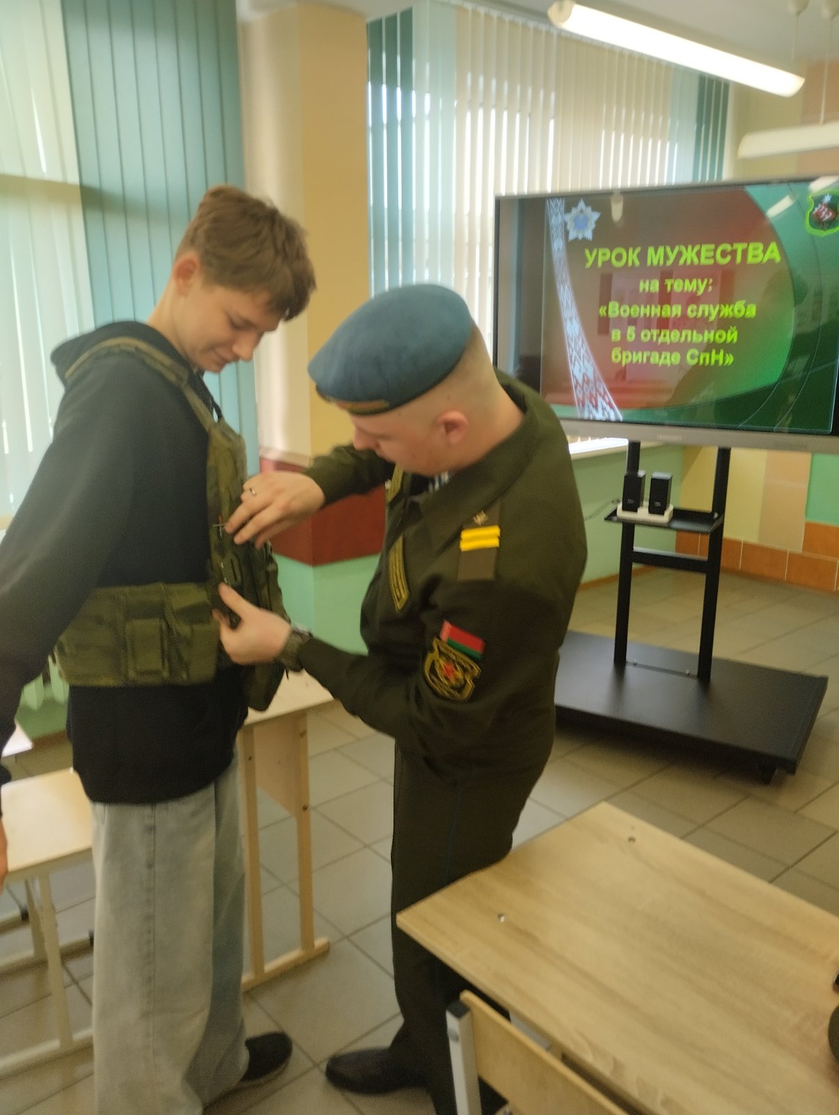 Также ребята ознакомились со службой в самой бригаде, с условиями срочной и контрактной военной службы. Затем учащиеся посмотрели видеофильм об Вооруженных Силах Республики Беларусь и имели возможность ознакомиться с экипировкой военнослужащего спецназа.