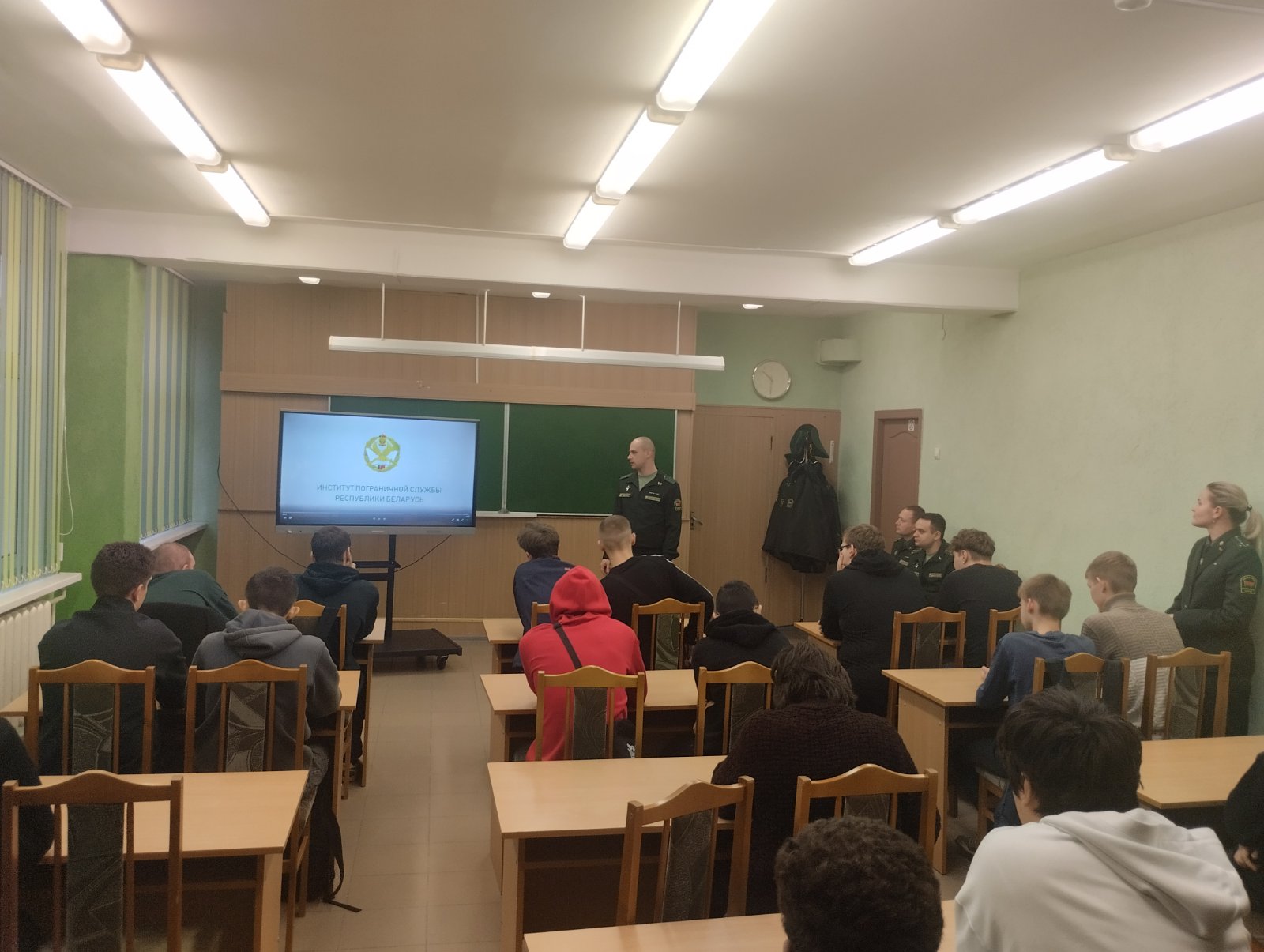 Учащимся было рассказано о службе в пограничных войсках, об условиях срочной и контрактной военной службы, условиях поступления в Институт пограничной службы Республики Беларусь. Затем учащимся были даны ответы на интересующие их вопросы.