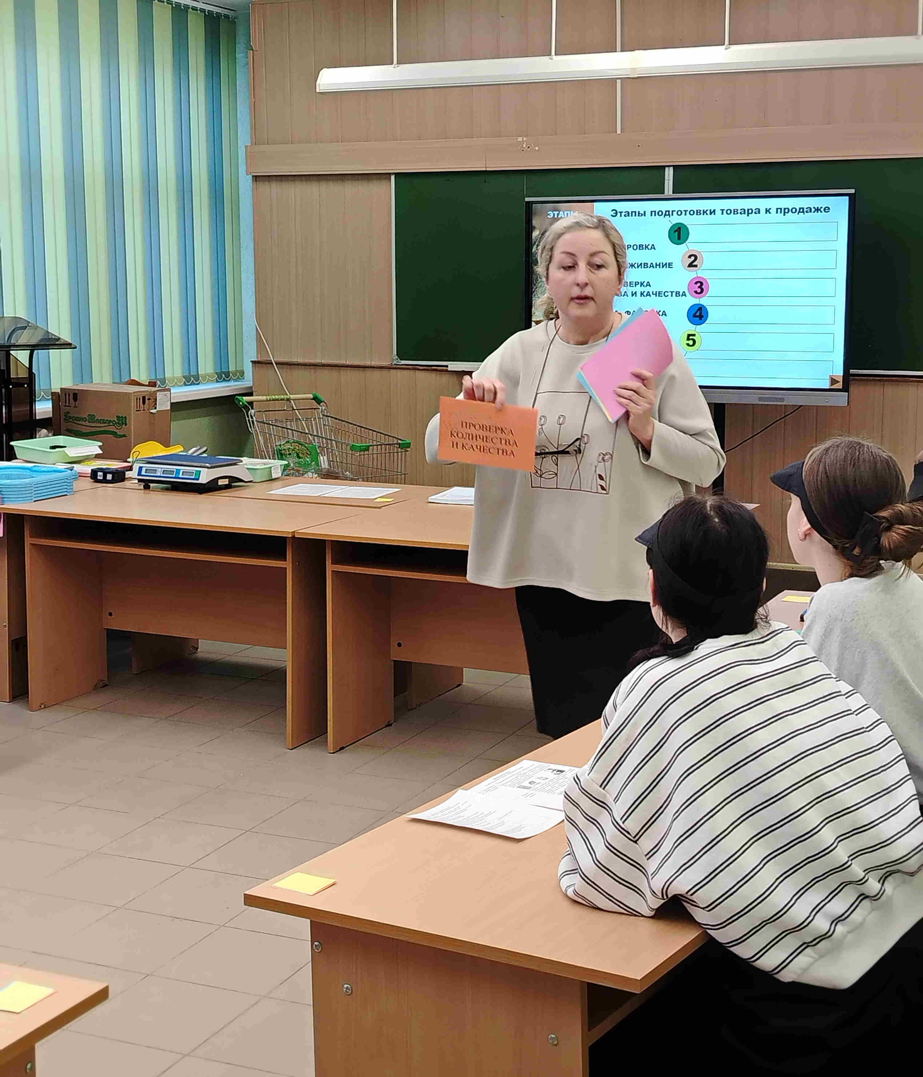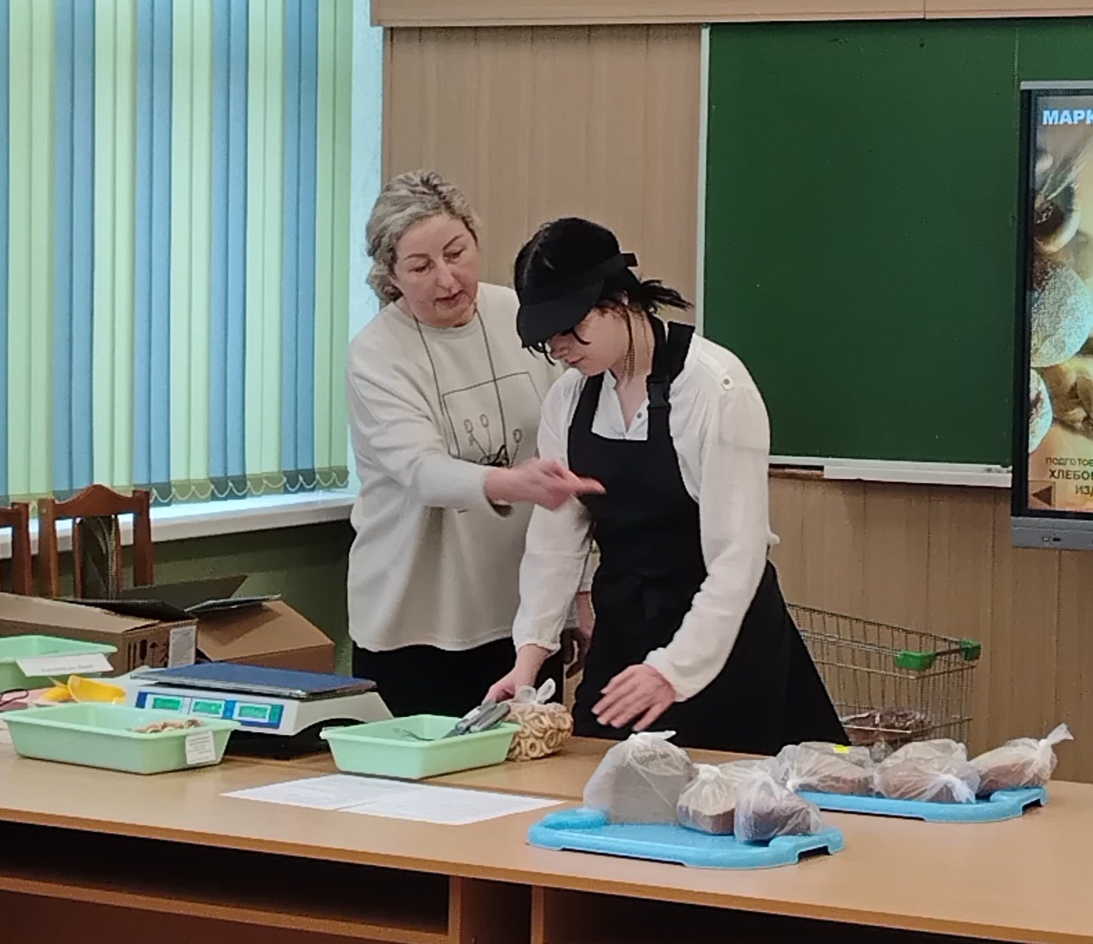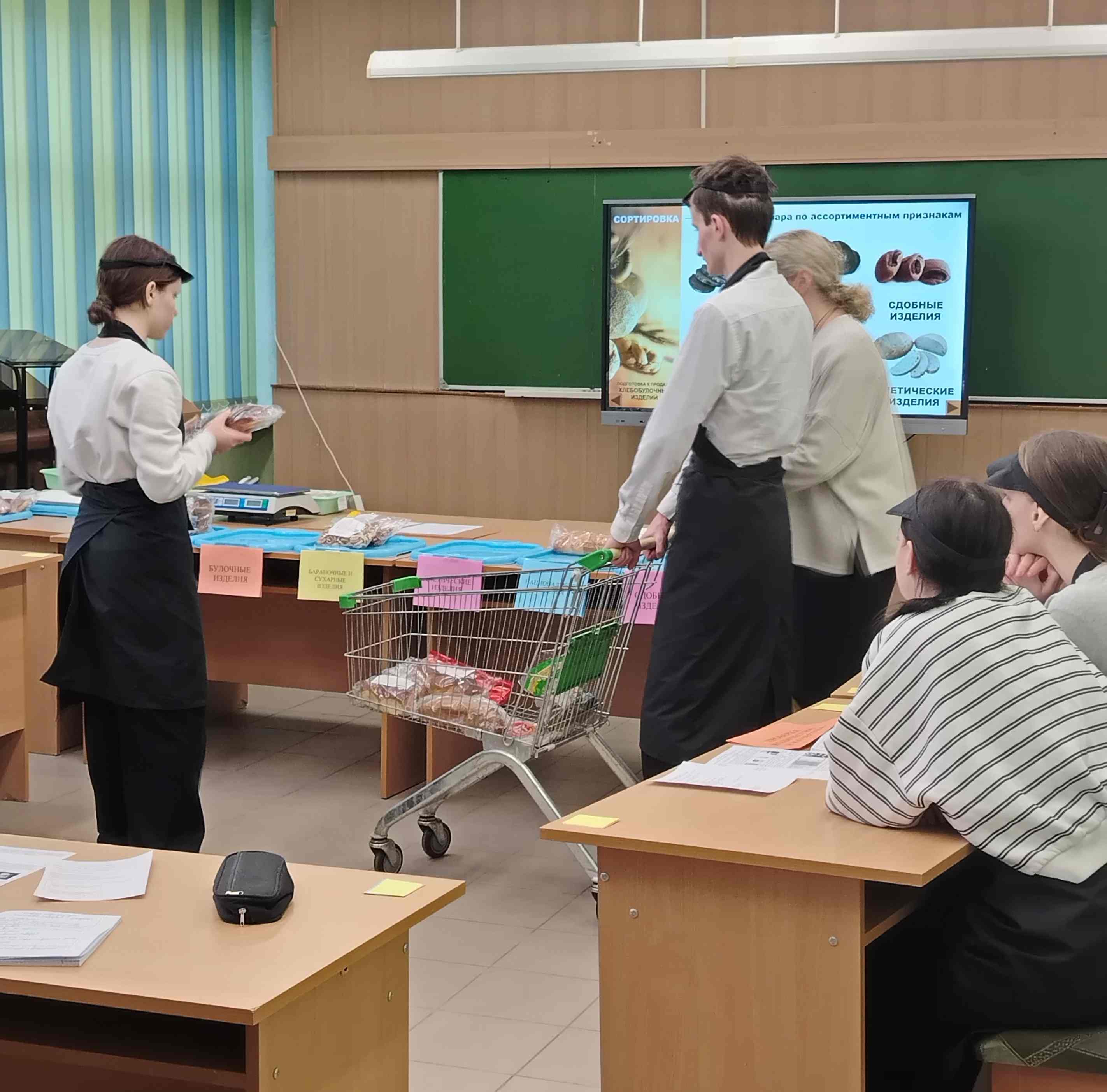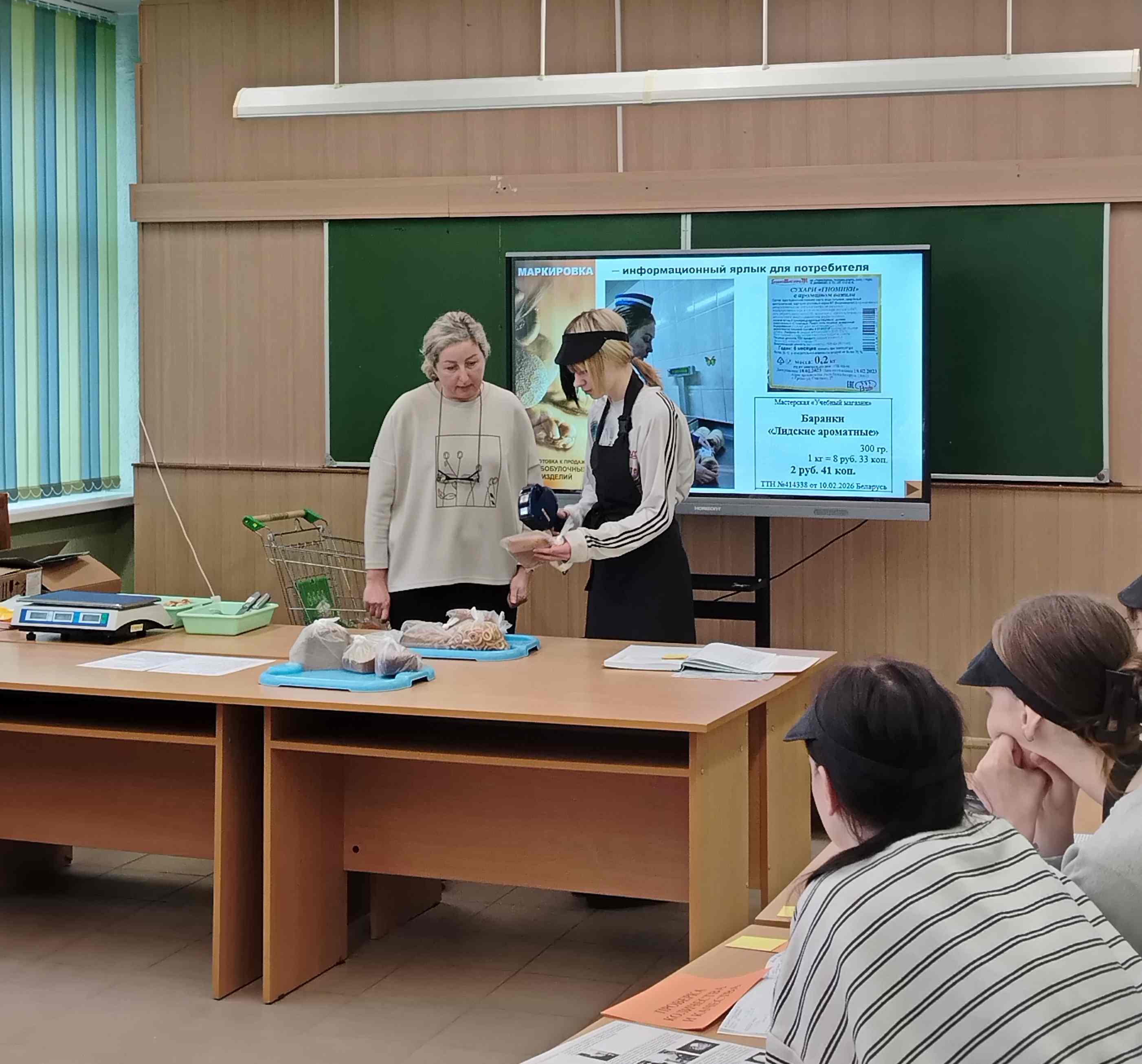 В ходе занятия учащиеся группы научились подготавливать рабочее место продавца, осуществлять приёмку хлебобулочных изделий по количеству и качеству, сортировать, фасовать, расшифровывать маркировку изделий, ознакомились со сроками реализации, оформили маркировку и ценники на изделия.