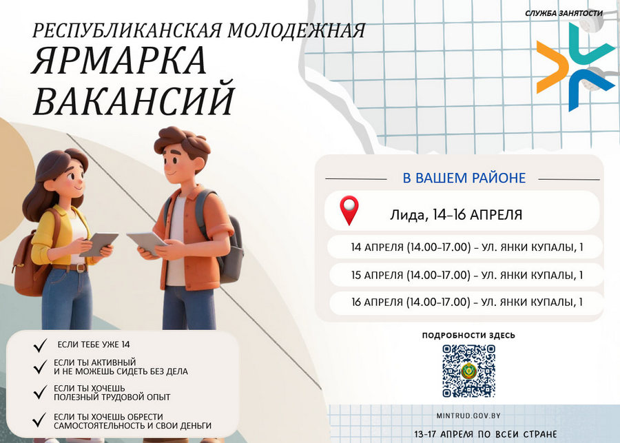 Управлением по труду, занятости и социальной защите Лидского райисполкома совместно с Лидской районной организации 00 «БРСМ», 14, 15 и 16 апреля с 14.00 до 17.00 в ГУ «Дворец культуры г.Лиды» (г.Лида, ул.Я.Купалы, 1) будет проводиться «Молодежная ярмарка вакансий» с целью оказания содействия в трудоустройстве в свободное от учебы время молодежи в возрасте от 14 лет.